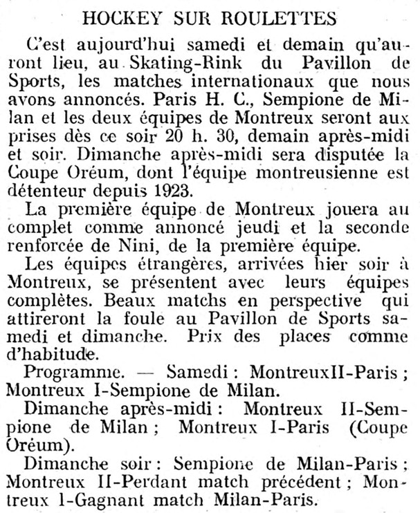 Der Paris HC war in Montreux zu Gast und trat ebenso wie Sempione Milan gegen den Montreux I und II an. Der Coupe Oréum wurde anlässlich dieses Turniers zwischen Montreux I und Paris ausgetragen. Montreux konnte diese Partie in der Verlängerung mit 4:3 gewinnen und im Finale um den Coupe de Montreux duellierten sich nach der Qualifikation ebenfalls wieder Montreux I und Paris. Diese zweite Affiche endete klarer, es stand am Ende 4:0 zu Gunsten von Montreux. So fand auch die Geschichte um die Sperre von Paris ein glückliches Ende…