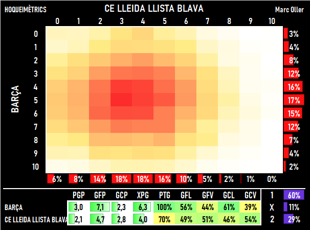 El Lleida solo tiene un 29% de posibilidades de llevarse el duelo de la jornada, aunque cabe el optimismo viendo sus últimos partidos. El Barça llega al encuentro con la friolera de siete goles a favor y dos en contra por partido. Lleida visitará el Palau con unas estadísticas algo más discretas, aunque tiene una expectativa de cuatro goles para este partido y mete más de la mitad de sus tantos como visitante. Los de la línea azul tienen por delante un reto difícil pero el hockey es hockey y podría pasar cualquier cosa.