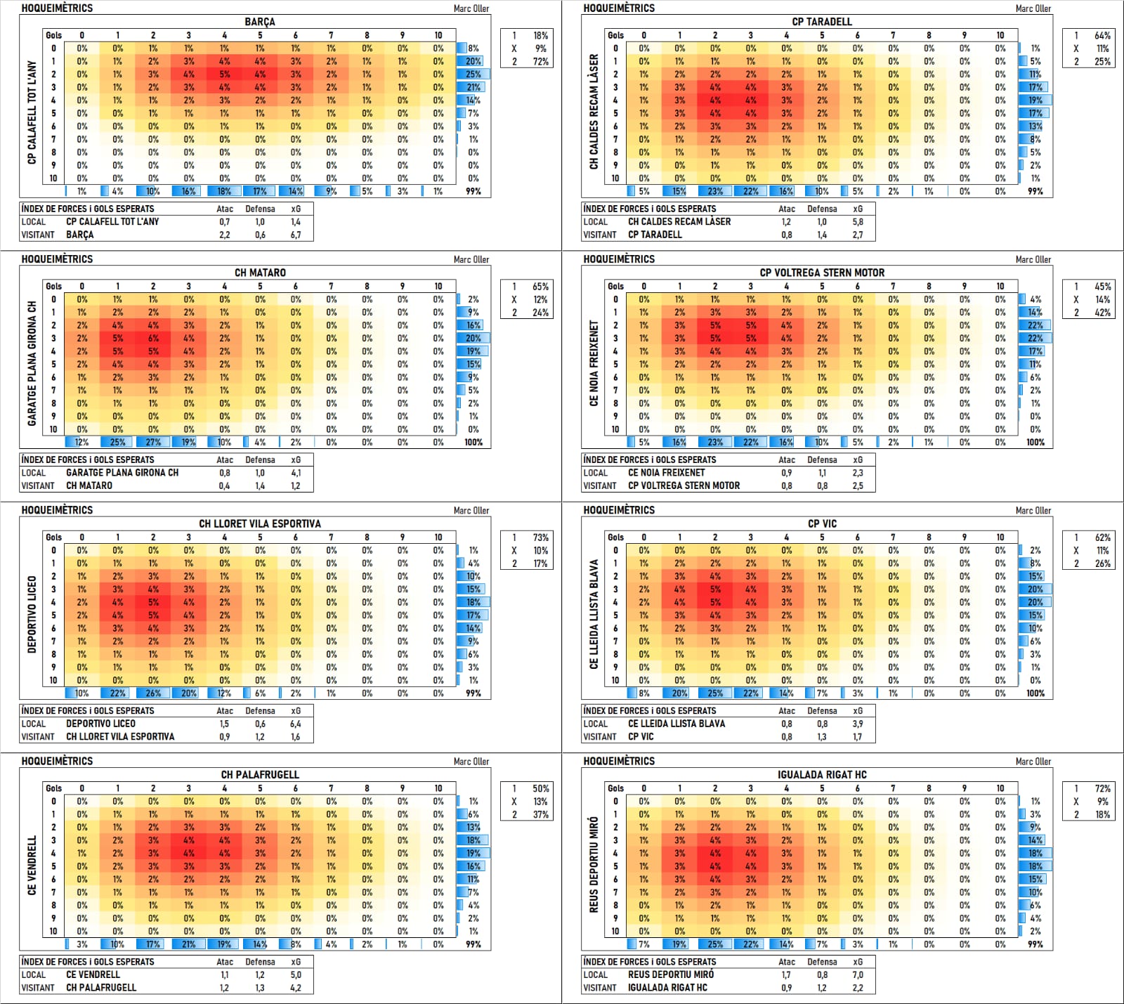 Noia tiene un 45% de posibilidades de ganar, y Voltregà sólo un 42%. En el resto de los partidos hay un claro favorito, ya que una derrota del Liceo, del Barça y del Reus Deportiu casi equivale a una sensación.